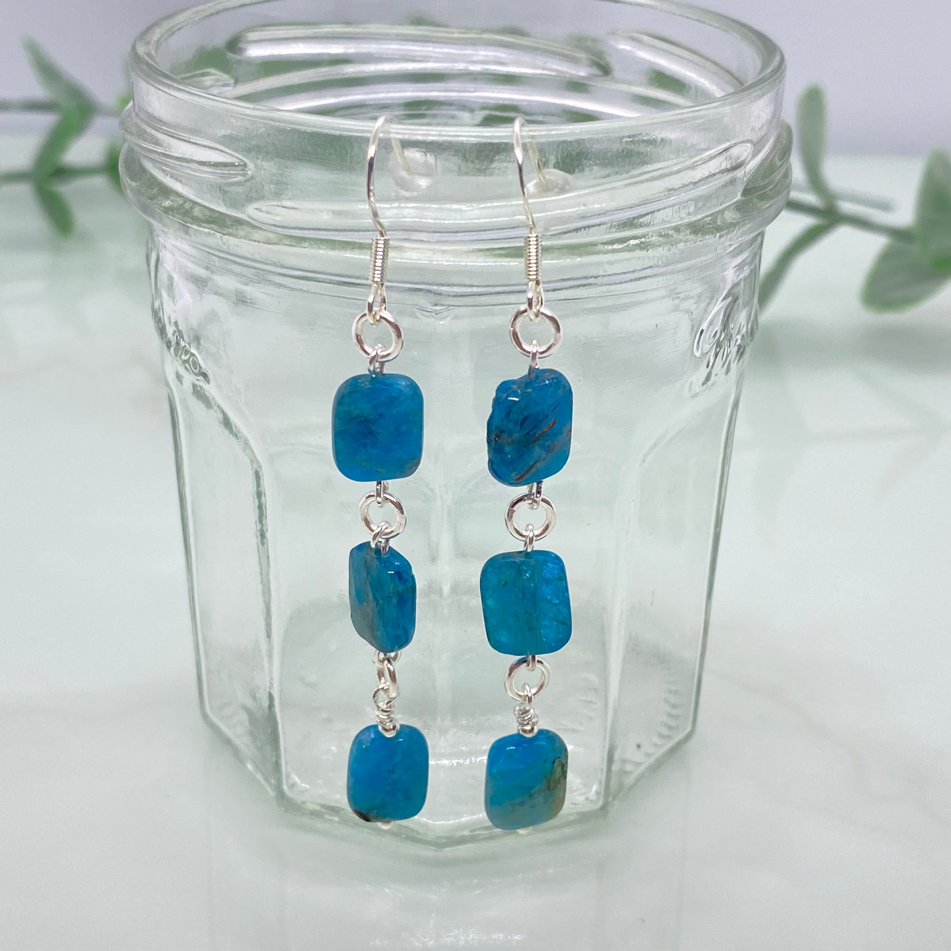 Bring a burst of ocean-blue energy to your wardrobe with these handcrafted Apatite dangle earrings. They are made with three faceted Apatite gemstones, linked with sterling silver for a graceful, lightweight drop.