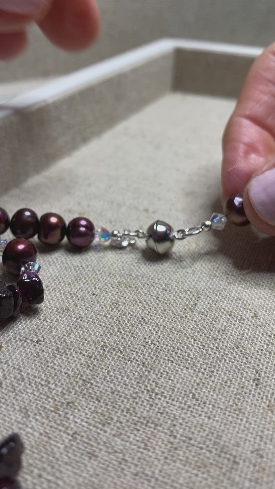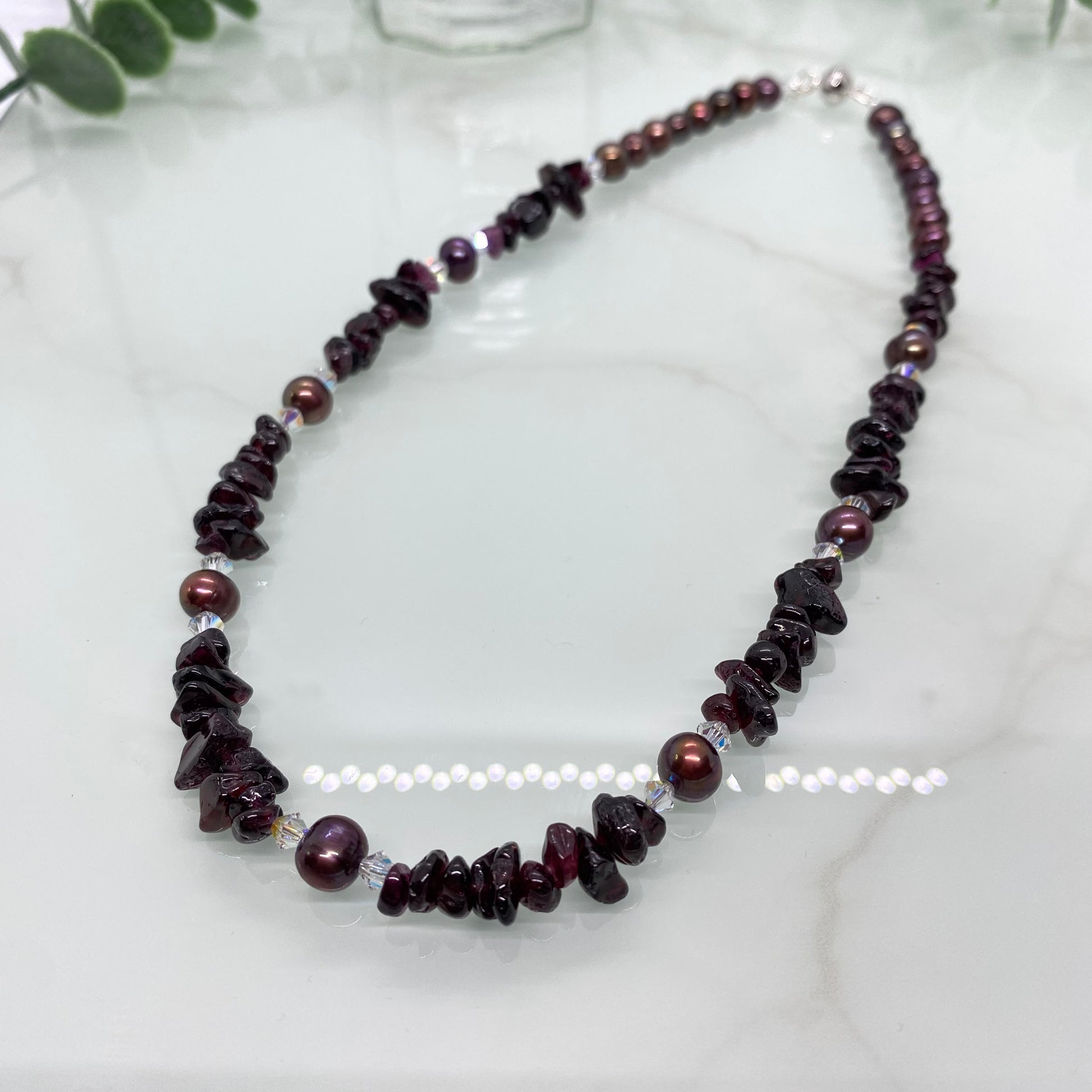 Rich, wine-toned garnet chip beads create natural texture and depth, complemented by softly iridescent freshwater pearls that catch the light with subtle shimmer. Clear crystal spacers add a gentle sparkle, bringing balance and flow to the design.