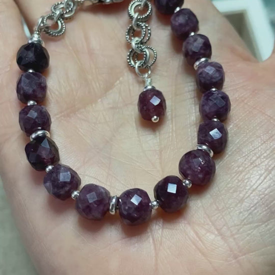 Rich and refined, this bracelet pairs deep purple-red faceted Garnet gemstones with a striking mix of shiny and antiqued sterling silver components for a look that’s both bold and timeless. The double ended lobster claw clasp, detailed with moulded silver flowers, adds a subtle touch of craftsmanship without feeling overly delicate.