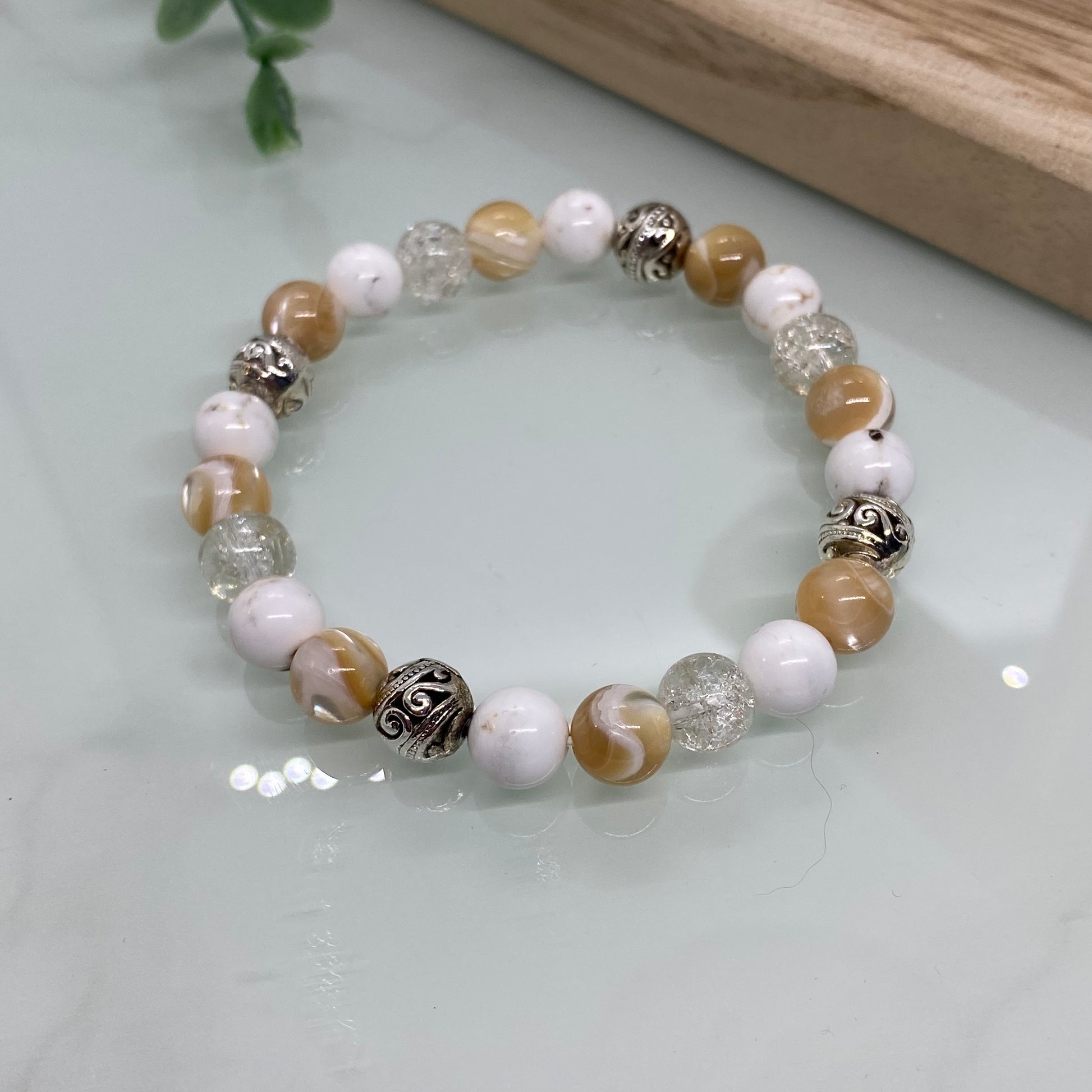 Featuring soothing howlite beads, natural sea shell (Trochidae) beads and sparkling crackle quartz, this handmade bracelet blends soft neutral tones with subtle texture. Finished with decorative Tibetan silver accents, it’s perfect worn alone or stacked with your favourite pieces.