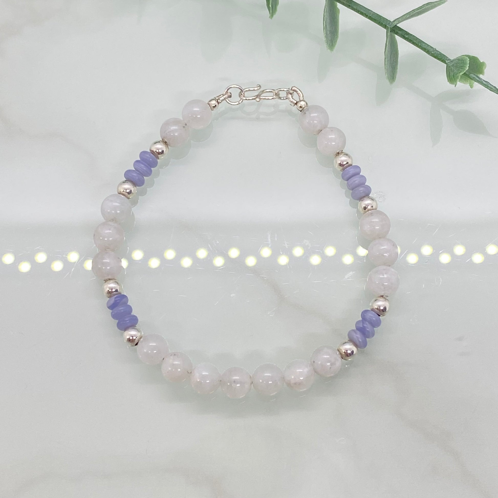 Ethereal, soothing and beautifully understated, this handcrafted bracelet blends the natural shimmer of Moonstone with the soft lilac tones of Blue Lace Agate. The iridescent Moonstone beads bring a subtle glow, while the calming Blue Lace Agate adds a gentle touch of colour and serenity. Sterling silver accents highlight the design with a clean, polished finish.