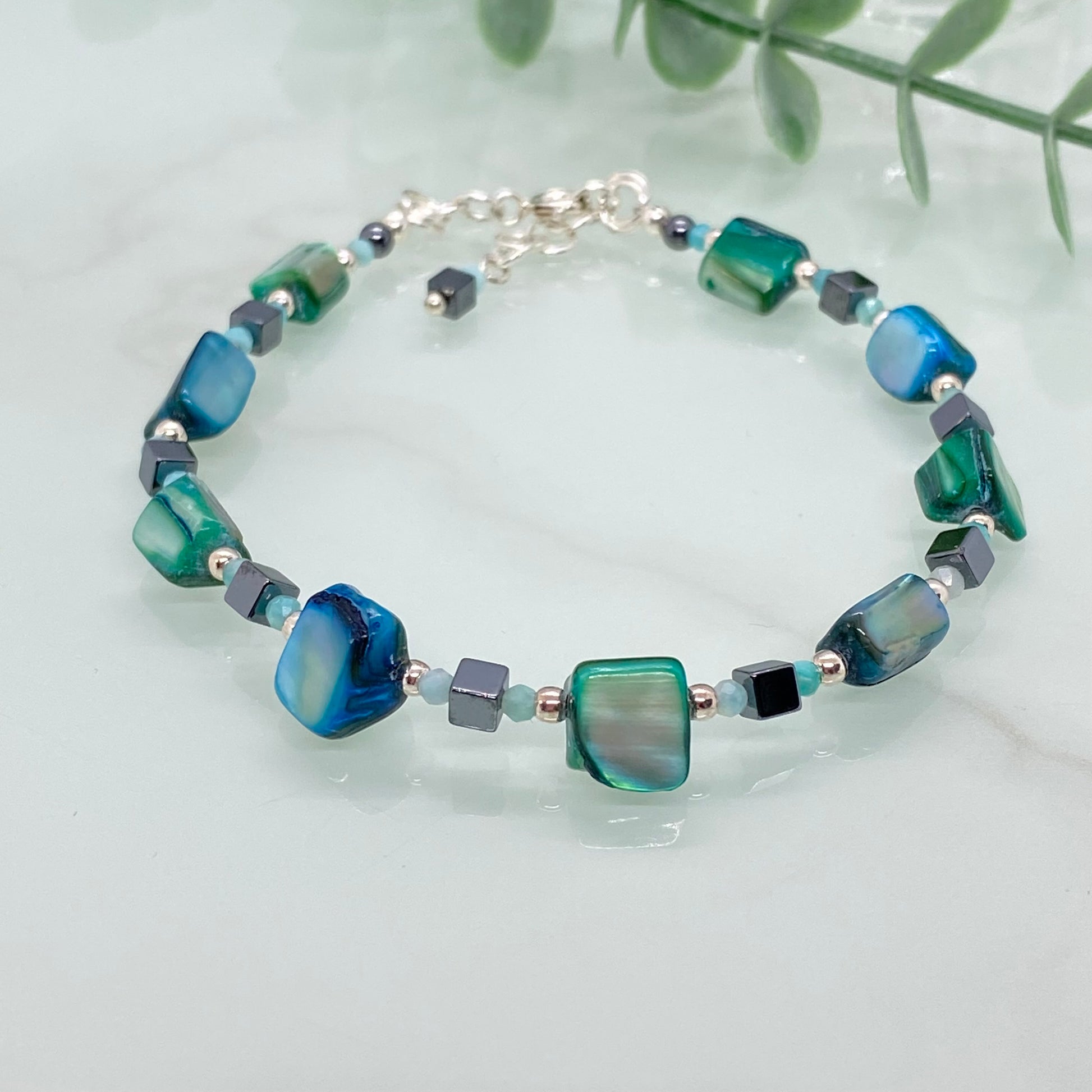 Fresh, iridescent and beautifully contemporary, this handcrafted bracelet blends green and teal Mother of Pearl with sleek Hematite cubes for a striking mix of shimmer and structure. The natural shell pieces shift between sea-green and deep teal tones, while the metallic Hematite adds a modern, geometric edge. Finished with tiny coordinating accent beads, the design feels vibrant yet refined.